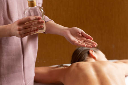 Masseur hands pouring aroma oil on man back. Masseuse prepare oil massage procedure for customer at spa salon in luxury resort. Aroma oil body massage therapy concept. Quiescent