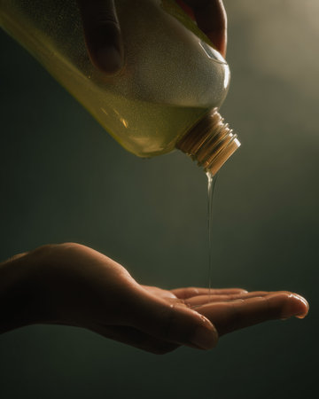 Close-up of a hand pouring shampoo from a bottle into another hand on a dark background. Cosmetic hygiene products.
