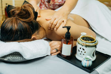 Young woman receiving a back massage in a spa center. Female patient is receiving treatment by professional therapist