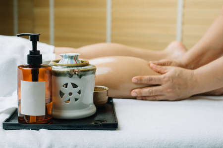 Masseuse preparing for doing aromatherapy oil massage in spa salon. Close-up of the hands of masseuse holding oil bottle in her hand. Young woman relaxing on a couch. Body care, massage, spa concept.