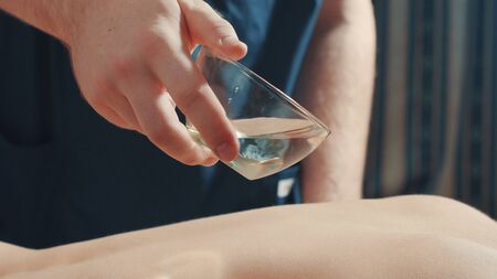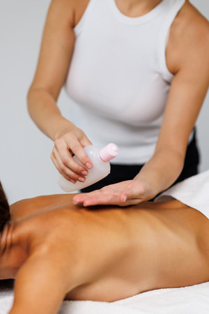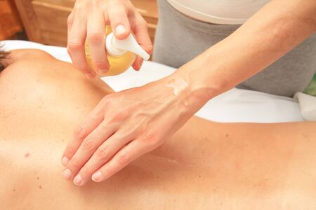 Close up of a woman masseur pouring massage oil on clients back at spa center