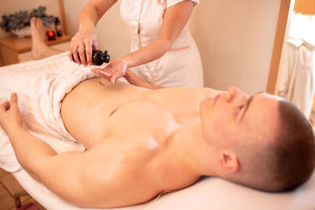 Close-up of man enjoying in relaxing back massage . Man relaxing on massage table receiving massage