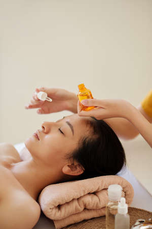 Cosmetologist applying soothing serum of face of client after beauty treatment