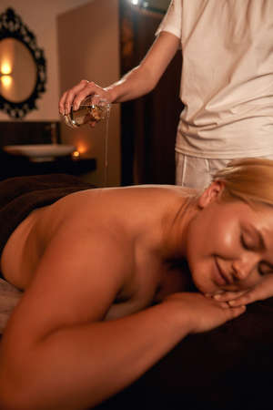 Closeup of masseuse pouring oil on sleeping woman back at luxury spa, body care, massage, spa concept. Young attractive lady enjoying relaxing massage with aromatherapy, copy space