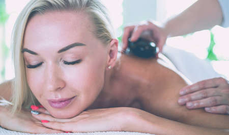 Asian young relaxing woman getting back massage therapy with hot stone. Attractive beautiful girl lying on massage table, getting physiotherapy from masseuse for skin and body care in spa beauty salon