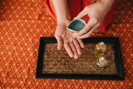 Ayurvedic aromatherapy oil massage. Masseuse holding Ayurveda oil for body massage