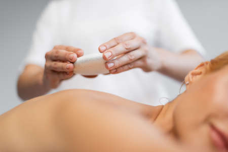Spa body, woman massage, girl massage, massaging. Beauty treatment concept. Health and relaxation concept, spa center. Masseur doing massages on woman body. Herapy, body care, massaging, aromatherapy