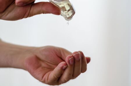 The man is pouring eau de Turkish Lemon Cologne to his hand and disinfecting the hand and killing the viruses