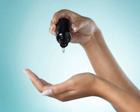 One drop does the trick. Shot of a young woman taking serum from a dropper against a grey background.