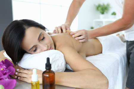 Ayurveda Massage concept. Beautiful young woman reciving relxing Massage of Her Oiled Back from Professional Masseur. Close Up