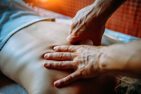 Professional masseur working with the back of a wellness spa center client. Remedial and therapeutic professional massage of woman's back