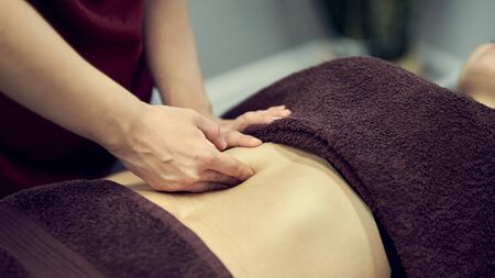 The masseur gives a massage to the female belly at the spa.