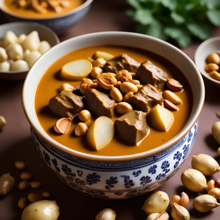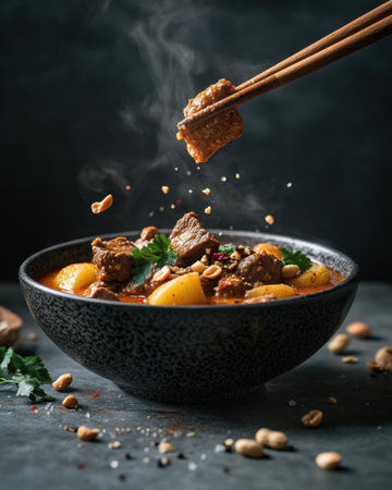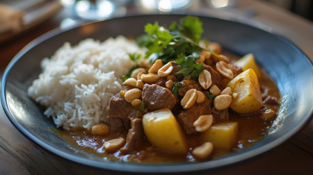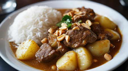 A delicious serving of Thai Massaman curry with beef, potatoes, and roasted peanuts.