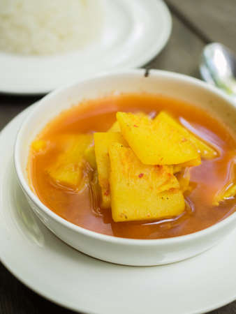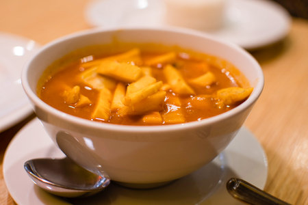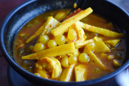 Slow view, yellow curry, or sea fish sour curry with coconut shoots. The food of Thai people is popular to eat. A white cup of curry is placed on a wooden table in a local restaurant. Closeup.