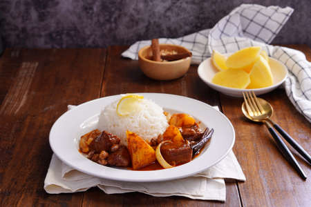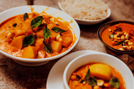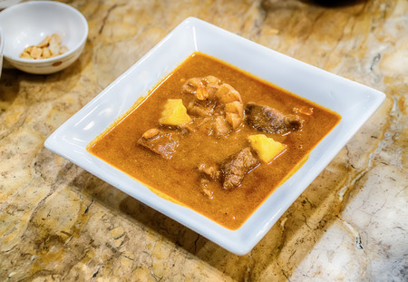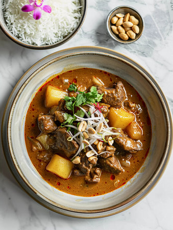 Traditional Thai beef massaman curry with peanuts and rice side dish. horizontal
