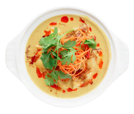 Bowl of Tom Yam, spicy curry dish, shot from above isolated on white background with clipping path