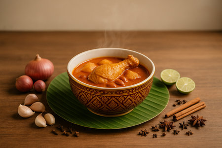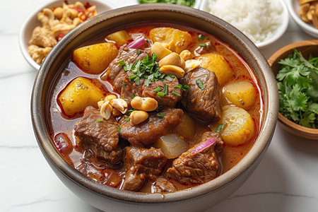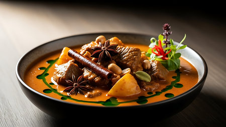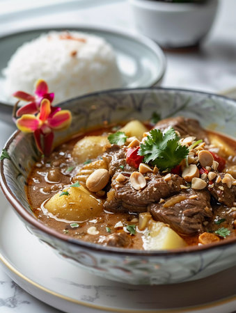 AI generated aromatic Thai massaman curry served in ornate ceramic bowl and fresh ingredients like potatoes, onions and roasted peanuts, steaming hot with rich coconut sauce