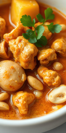 Massaman curry with potatoes and chicken, garnished with cilantro. Rich Thai curry served on plate. Concept of Thai cuisine, flavorful dishes, comfort food, Asian culinary tradition.