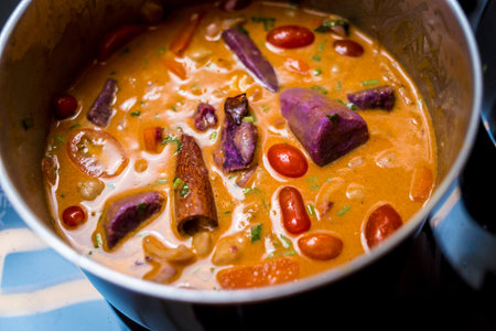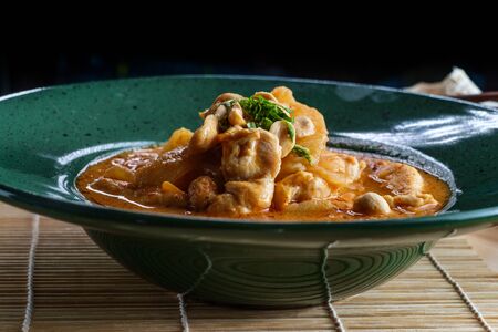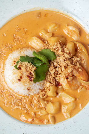 Thai food spicy coconut milk massaman curry soup with chicken and potatoes