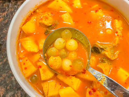 Closeup of small catfish egg on spoon in yellow or orange color spicy soup bowl, Thai traditional seafood curry at restaurant or homemade
