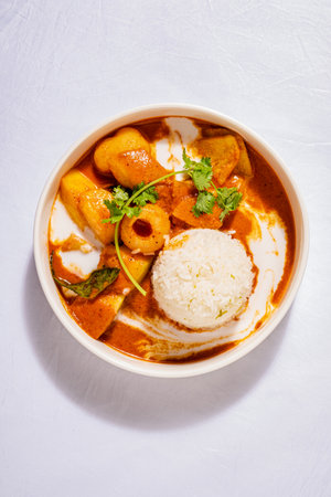 Homemade Massaman Chicken with Chili Paste, Coconut Milk and Onions, Steamed Rice on a White Plate