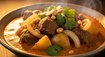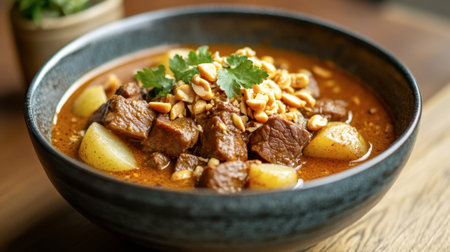 a comforting Massaman curry with tender chunks of beef, potatoes, and roasted peanuts in a flavorful. Ai generative