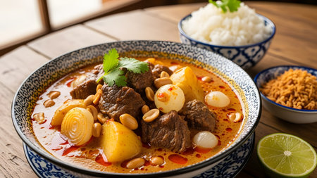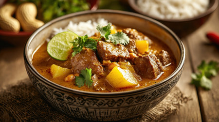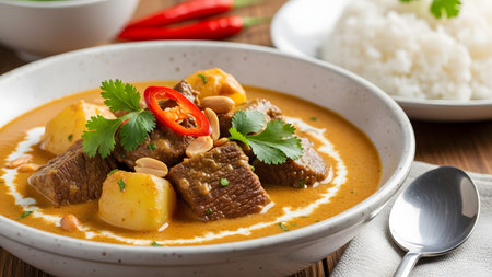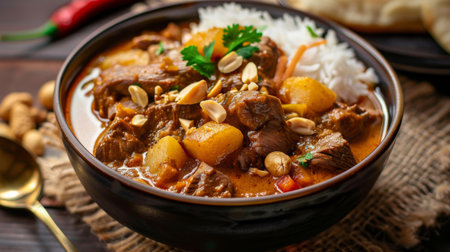 A rich and creamy Thai massaman curry with beef, potatoes, and peanuts, served in a traditional bowl with rice on the side.