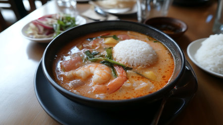 A flavorful bowl of shrimp soup served with rice and fresh vegetables. Perfect for a satisfying meal, this dish offers a rich and aromatic experience.