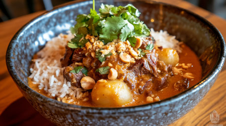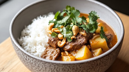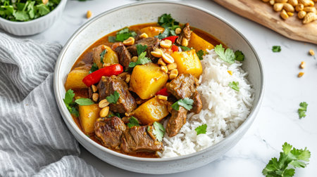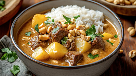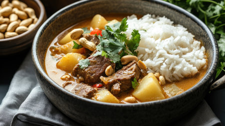 A bowl of rich and creamy Thai massaman curry with tender beef, potatoes, and roasted peanuts, served with jasmine rice