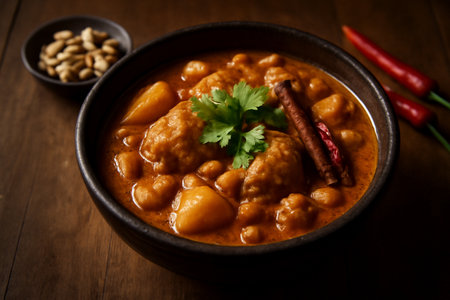 AI generated image of a warm and aromatic chicken massaman curry served in a dark earthenware bowl, capturing the rich textures, bold colors, and earthy warmth of traditional Thai cuisine.