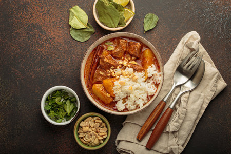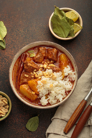 Delicious massaman curry with beef, potatoes, rice, and peanuts is served in bowl top view, Thai cuisine