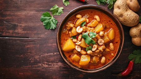Top view of Thai massaman curry with peanuts and potatoes, ample copy space