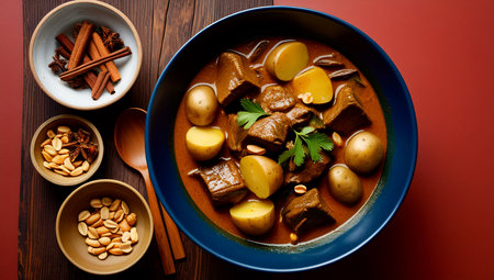 Elegant flat lay of Thai Massaman beef curry in fine dining presentation, surrounded by traditional spices and premium food styling.