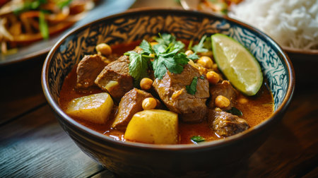 Beef stew with chickpeas and potatoes in a bowl. Traditional Thai Dish, Massaman Curry