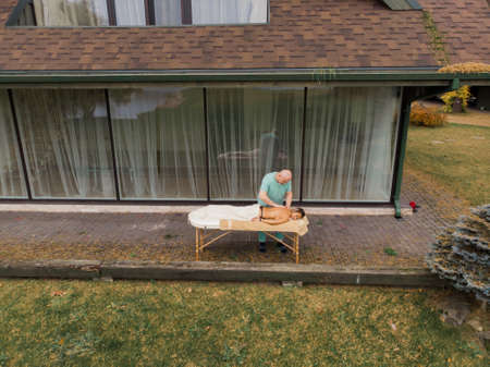 AERIAL: Blonde woman relaxing receiving back massage from male physiotherapist outdoor in wood country house lying on massage table. Young girl with tattoos relaxing destination
