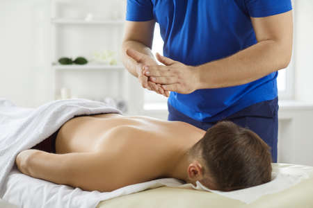 Professional masseur or manual therapist warming up cream, lotion or oil in his hands and getting ready to massage clients back while the relaxed young man is lying face down on massage table