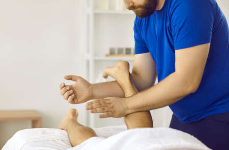 Professional doctor massaging young mans leg. Physiotherapist, massagist, chiropractor or osteopath massaging ankle, shin and calf muscles. Cropped shot. Physiotherapy treatment concept