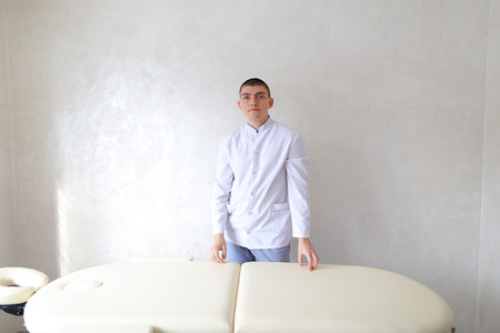 Portrait of a masseur. Masseur grooves into couches. Massage couch is behind him. Massage supplies in background. Masseur looks into camera. Concept of work in spa area. Portrait manual therapist.