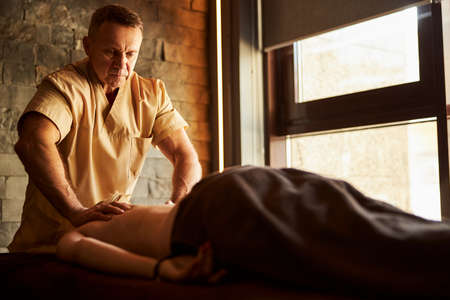 Massaging back. Dark-skinned therapist wearing uniform massaging back for man in shorts