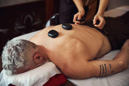 Focus on the hands in massage oil of a physiotherapist massaging the man's back in wellness spa clinic. Blurred mature man lying on a massage table and enjoying, getting relaxing massage. Body care