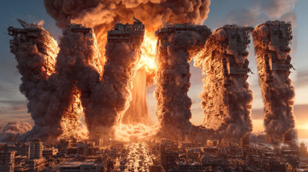 AI Generated. A city destroyed by rocket attacks is shrouded in fire and smoke