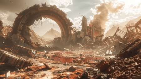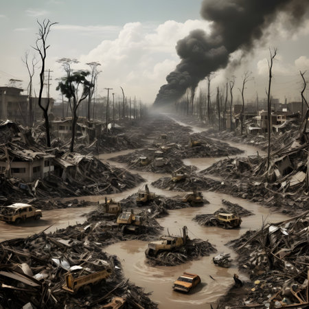 Desolate urban landscape filled with collapsed structures and debris in a post-apocalyptic city ruins scene after a catastrophic war. AI-generated content