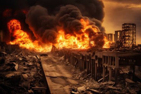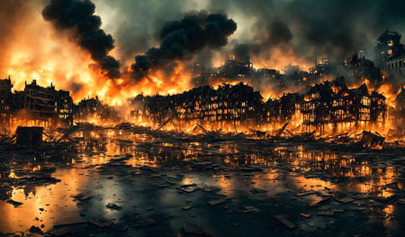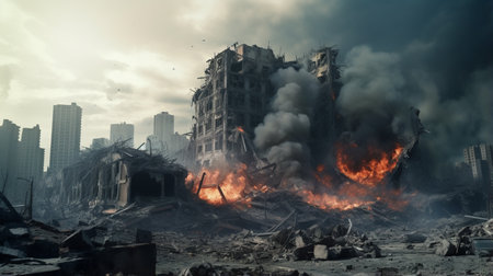 AI Generated. Ruined cityscape with fires raging under a gloomy sky