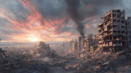 A destroyed city skyline, sunset, smoke, dramatic sky, urban ruins, apocalyptic mood