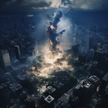 Amidst the chaos of destruction, a city lies in ruins, shrouded in a thick cloud of smoke. Buildings are flattened, and dust hangs heavy in the air, evoking a sense of despair and loss.