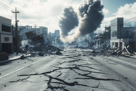 An urban street shows severe damage with cracks in the asphalt after a disaster. Dark smoke rises in the background, indicating ongoing emergencies.