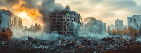 War-torn showing extensive aerial view of a war-torn city with numerous destroyed buildings emitting smoke and fire amidst widespread rubble and debris keywords:...