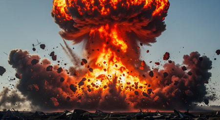 An intense nuclear explosion with a mushroom cloud, showcasing the power and destruction.