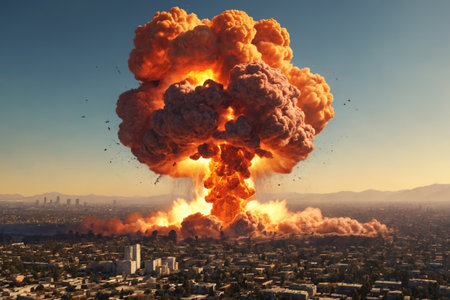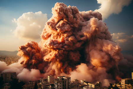 The image captures the moment of a catastrophic explosion with a mushroom cloud rising over the city, symbolizing a powerful and destructive event.