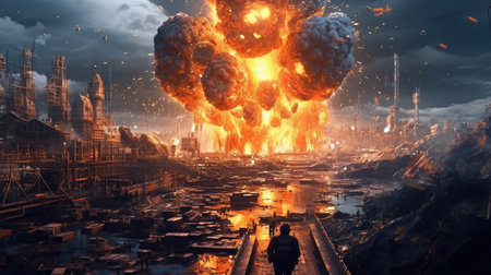 Dramatic urban disaster scene with explosion. Flames. Debris. And destruction in the cityscape. Depicting the chaotic aftermath of a powerful detonation. With burning skyscrapers. Emergency response